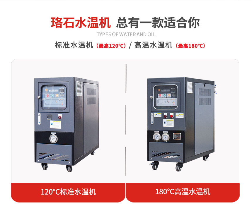 ?水循環(huán)溫度控制機又叫水溫機,水溫機主要有兩種,標(biāo)準(zhǔn)型和高溫型。標(biāo)準(zhǔn)型水式模溫機工作最高溫度為120℃,高溫型水式模溫機工作最高180℃。
