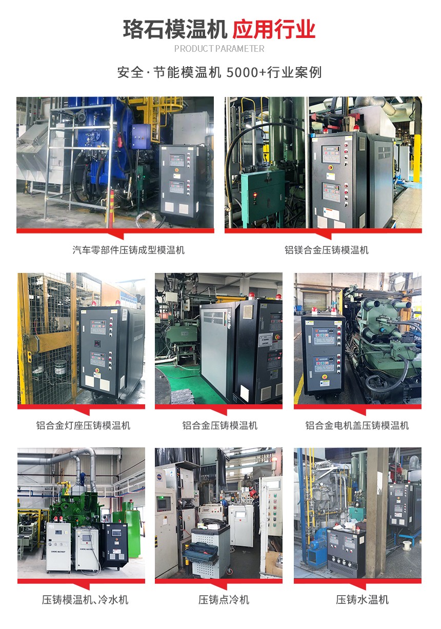 壓鑄模溫機(jī)運(yùn)用于壓鑄模具,鋁合金壓鑄等行業(yè)的溫度控制。標(biāo)配德國磁力泵,控溫精度高,導(dǎo)熱速度快,可自動(dòng)吸出回油,負(fù)壓運(yùn)轉(zhuǎn)。減少模具預(yù)熱時(shí)間,提升壓鑄件質(zhì)量和生產(chǎn)效率。